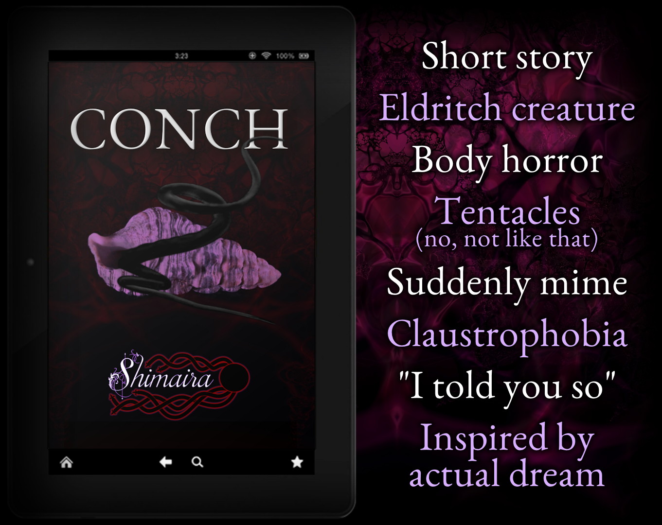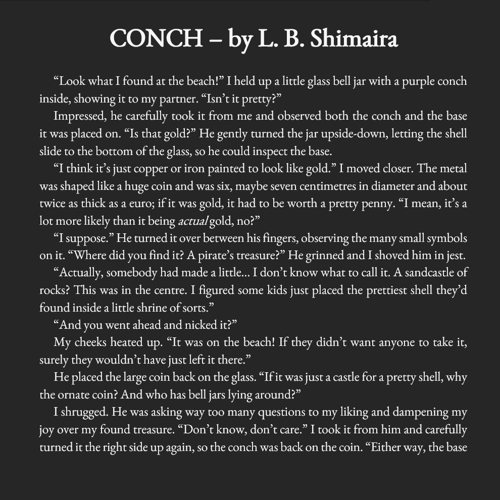 🐚 Fun fact about the story CONCH: This is almost a full retelling of a nightmare I had. Unlike the MC in the story, though, I managed to wake up before things got really bad.
