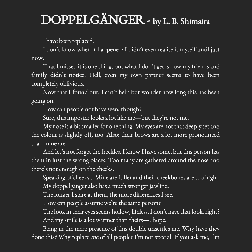 👥 Fun fact about DOPPELGÄNGER: This story was inspired by an actual 2AM mirror gazing mistake.